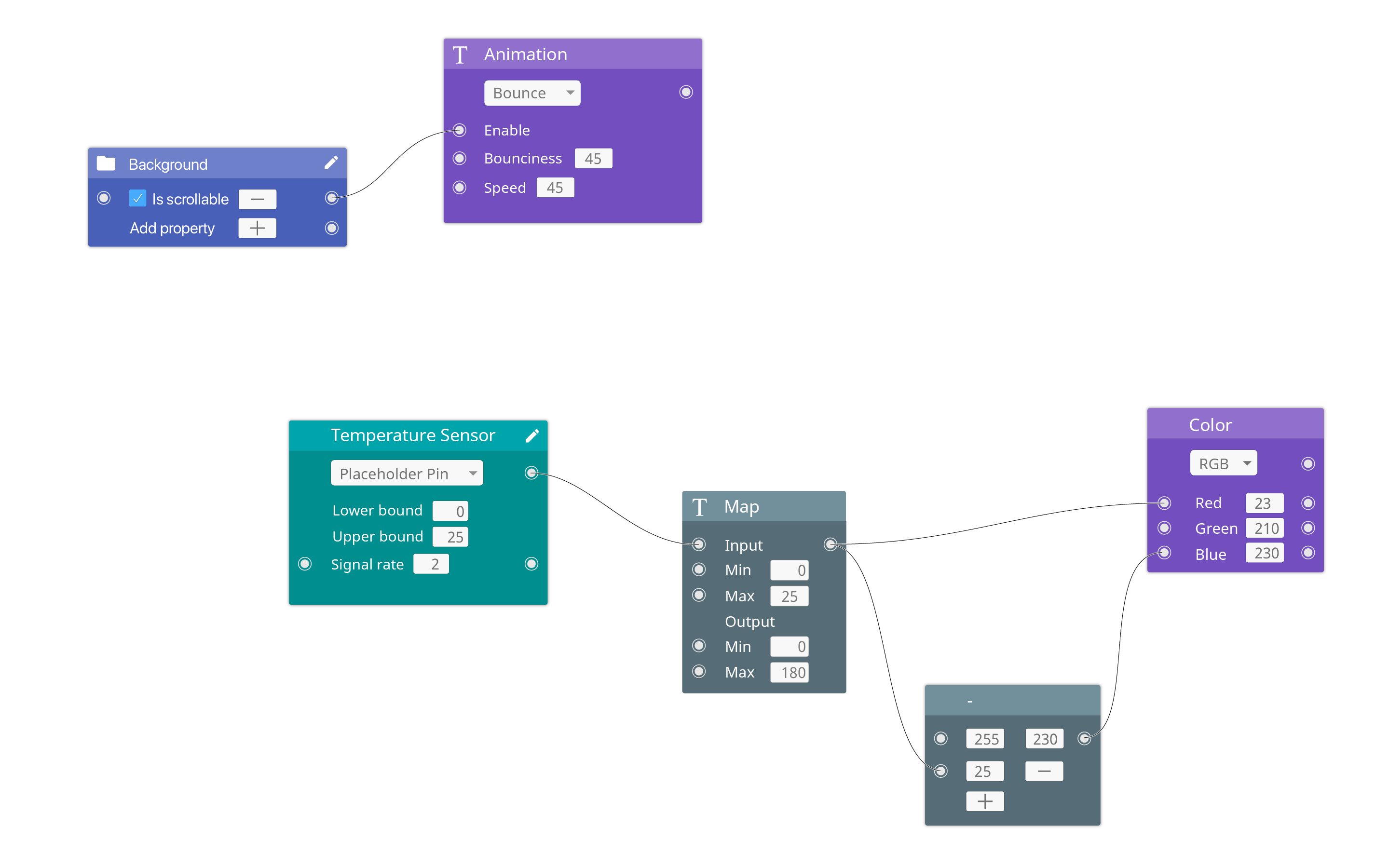 Often times, the screen design is developed further than the hardware. To let users create prototypes despite no actual data coming in, Wires is able to generate placeholder data where sensor input would normally occur. This way the prototype can be simulated even when no hardware is actually present. All features are detailed in our sample use case below.